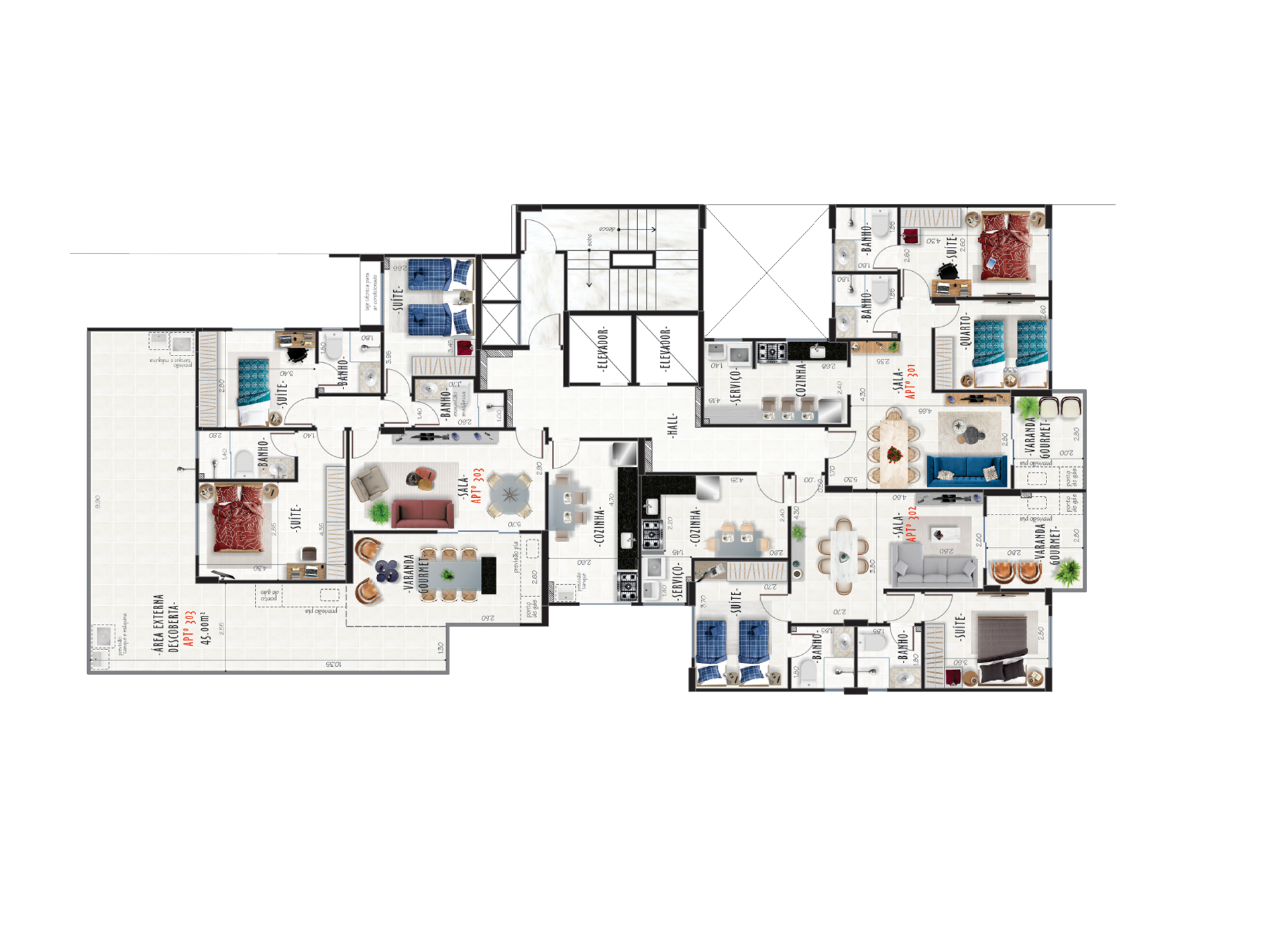 Opções em 02 quartos com 01 ou 02 suítes, ou 03 suítes.